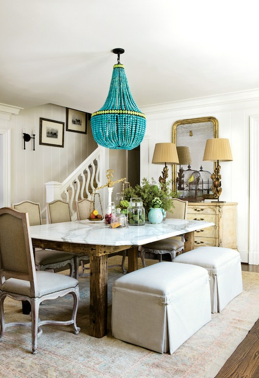 Note the marble table on top of the rustic wood table. I would not want to lift this slab, but it looks very eclectic. Also note the more tailored looking benches with side pleating and tabs.